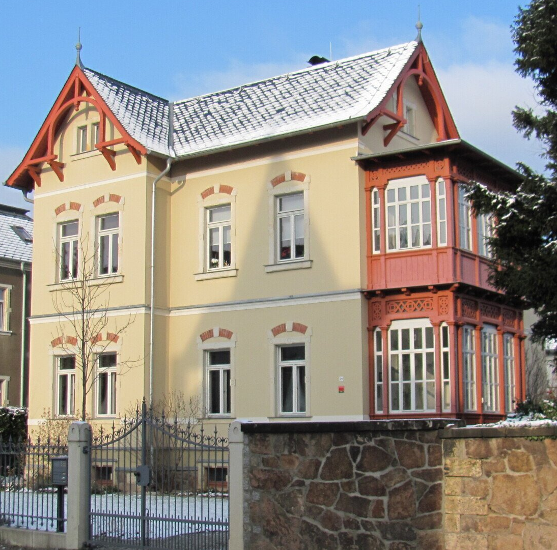Dem von Baumeister Große aus Kötzschenbroda 1898 errichteten repräsentativne zweigeschossigen Wohnhaus gab der Bauherr mit sicherem Blick fürs Detail sein typisches Aussehen zurück. Das sanierte Grundstück strahlt nun als Gesamtanlage mit Vorgarten, Wegen und der aufgearbeiteten schmiedeeisernen Einfriedung wieder Leichtigkeit wieder aus. Mit der Wiederverwendung und Ergänzung ortstypischer Materialien, der Erhaltung des Natursteinsockels, der Ausarbeitung und bedachtsamen Ergänzung des Holzdachtragwerkes ist der Bauherr nach streng denkmalpflegerischen Gesichtspunkten vorgegangen. Mit der Wiederherstellung der Fassadengliederung und der dezenten Farbgebung ist es gelungen, an die zu Ende des 19. Jahrhunderts angestrebte hohe Baukultur anzuknüpfen.